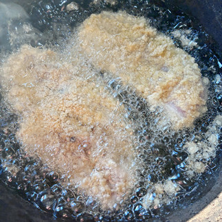 Heat 1/2 cup of vegetable or canola oil in a heavy skillet or cast-iron pan over medium-high heat until very hot but not smoking. Carefully add two pieces of chicken at a time to the pan. Fry for about 2 minutes on each side, or until golden brown. Use a spatula to gently loosen the cutlets from the pan to avoid tearing the crust.