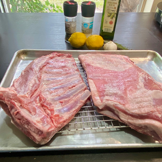Place each breast piece, fat side up, on a long piece of aluminum foil. Salt and pepper liberally. Spread the sliced lemons over both plates. Put 1-2 sprigs of rosemary and half of the bulb of garlic on each plate. Wrap the breastplates individually and place them on a rack over a half-sheet pan or other sheet pan. As the lamb cooks slowly, it will infuse with garlic, lemon, and rosemary. Your home will smell wonderful!